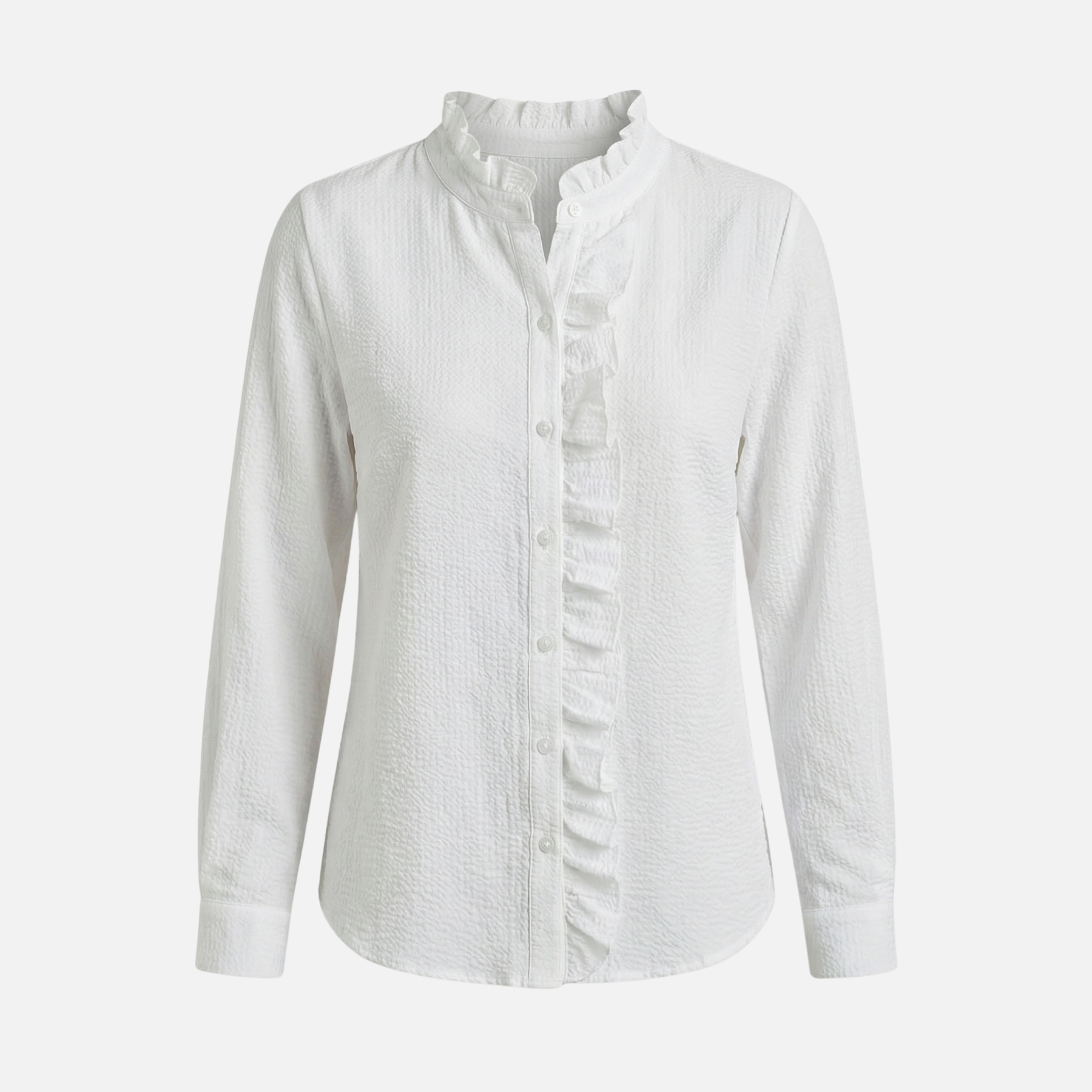 Die feminine Bluse mit Rüschensaum bietet einen modernen und zugleich zarten Look für den Alltag oder das Büro. Sie besteht aus einem leichten Stoffmix mit einem entspannten Schnitt, der sich locker anpasst. Die Bluse zeigt lange Ärmel und einen knöpfbaren Vorderteil, während der rüschige Saum entlang der Knopfleiste einen dezenten, verspielten Akzent setzt.