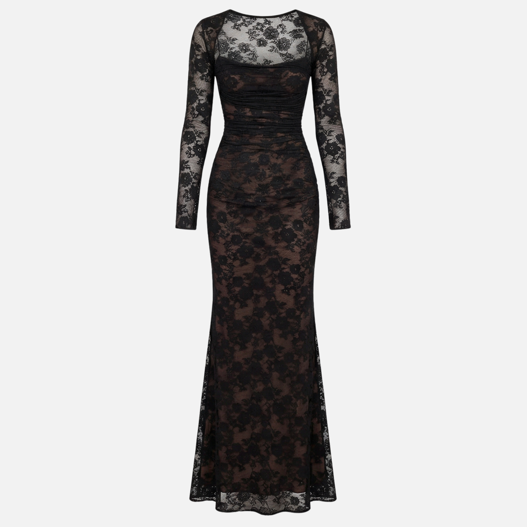 Dieses durchsichtige Spitzenkleid mit Korsett-Schnitt vereint Eleganz und Raffinesse. Das Kleid bietet eine figurbetonte Passform mit einem Korsett-Oberteil und zarten Spitzenakzenten, die für einen femininen Look sorgen. Mit langen Ärmeln und einem quadratischen Ausschnitt verleiht es eine klassische, dennoch moderne Silhouette, die sich für formelle Anlässe oder Abendveranstaltungen eignet.