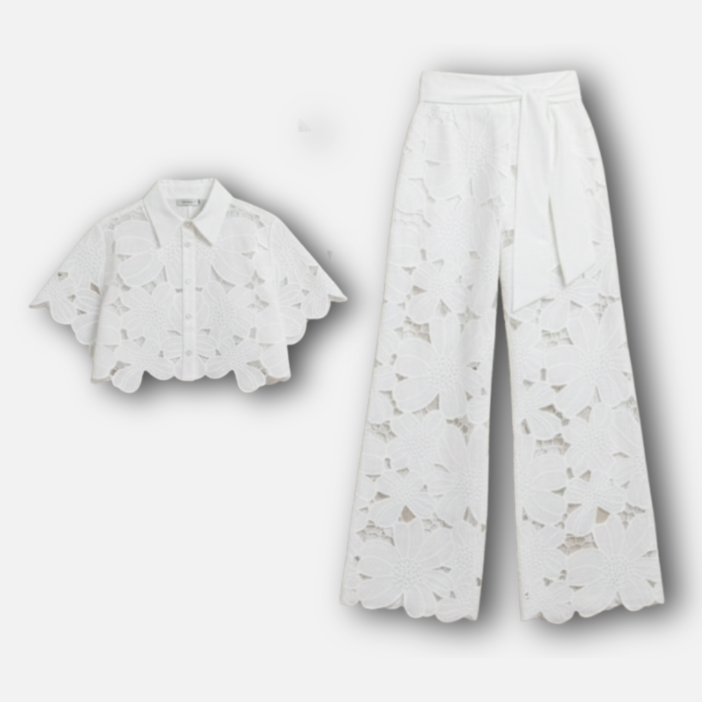 Das zweiteilige Set mit floralem Cutout-Stickerei und gewelltem Saum bietet einen frischen, femininen Look, der perfekt für wärmeres Wetter ist. Das Set besteht aus einer Knopfleiste-Oberteil und weiten Hosen, die beide mit zarter floralem Cutout-Stickerei verziert sind, was Textur und einen Hauch von Eleganz verleiht. Gefertigt aus leichtem, gewebtem Stoff, sorgt der lockere Schnitt für eine luftige, schmeichelhafte Silhouette. Der selbstbindende Taillengürtel ermöglicht eine anpassbare Passform, während der gewellte Saum einen raffinierten, eleganten Touch hinzufügt. Mit klaren Linien und auffälligen Details gestaltet, ist dieses Set in mehreren Größen erhältlich, um verschiedenen Vorlieben gerecht zu werden.